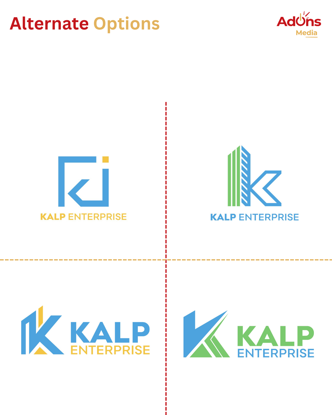 We explored architectural forms to merge them seamlessly into the initial “K,” representing both identity and industry. The upward structure conveys growth, while the bold form ensures authority and impact. The blue palette was chosen to symbolize trust, dependability, and stability—qualities central to Kalp Enterprise’s business ethos.